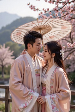 A serene couple's moment: a man and woman, dressed in hanfu, stand together under the gentle drizzle, holding a West Lake Silk Umbrella. The man's arm wraps around the woman's waist, as she gazes up at him with a soft smile. They're surrounded by the tranquil Apricot forest, where pink and white petals cling to the trees, glistening with cold dew. In the distance, the majestic mountains rise, their peaks hidden in the misty haze. Soft, crisp light emanates from the smoke-filled cage, casting a warm glow on the scene. The focus is sharp, with intricate details and textures visible even at 32K UHD resolution.