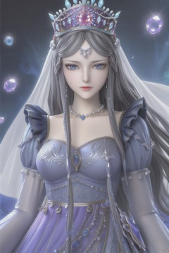 masterpiece, best quality, masterpiece,best quality,official art,extremely detailed CG unity 8k wallpaper,1girl,solo,long hair,looking at viewer,blue eyes,grey hair,jewelry,long sleeves,dress,necklace,blue dress,crown,crystal,gem