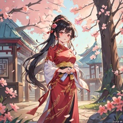 couple,Black hair,tree branches,breasts,cherry blossoms,Chinese clothing,earrings,flowers,hair accessories,Hanfu,long hair,mid chest,petals,movie shots,ray tracing,background Chinese style architecture palace,
