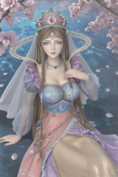 masterpiece, best quality, masterpiece,best quality,official art,extremely detailed CG unity 8k wallpaper,1girl,solo,long hair,looking at viewer,blue eyes,brown hair,dress,jewelry,sitting,braid,earrings,necklace,makeup,crown,large breasts,veil,Cherry Blossoms,water