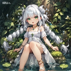 score_9,score_8,score_7, Traptrix, 1girl, solo, long hair, looking at viewer, open mouth, dress, jewelry, sitting, very long hair, green eyes, full body, braid, white hair, barefoot, water, twin braids, anklet, barefoot sandals