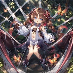 score_9,score_8,score_7, Traptrix, 1girl, solo, long hair, looking at viewer, open mouth, blue eyes, brown hair, hair ornament, navel, twintails, jewelry, very long hair, full body, braid, flower, detached sleeves, bug, monster girl, extra eyes, arthropod girl, silk, spider web, spider girl, arthropod limbs