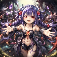 score_9,score_8,score_7, Traptrix, 1girl, solo, long hair, looking at viewer, smile, open mouth, hair ornament, red eyes, navel, collarbone, purple hair, braid, pointy ears, twin braids, tattoo, fangs, outstretched arms, claws, duel monster