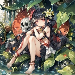 score_9,score_8,score_7, Traptrix, 1girl, solo, long hair, looking at viewer, bangs, skirt, black hair, hair ornament, red eyes, jewelry, very long hair, tail, braid, flower, barefoot, hair flower, bell, leaf, plant, armlet, skull, water drop, anklet