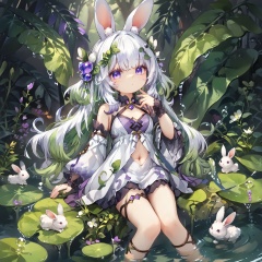 score_9,score_8,score_7, Traptrix, 1girl, solo, long hair, hair ornament, dress, navel, animal ears, sitting, purple eyes, white hair, multicolored hair, detached sleeves, green hair, barefoot, water, plant, rabbit, anklet