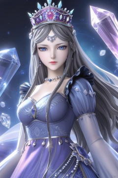 masterpiece, best quality, masterpiece,best quality,official art,extremely detailed CG unity 8k wallpaper,1girl,solo,long hair,looking at viewer,blue eyes,grey hair,jewelry,long sleeves,dress,necklace,blue dress,crown,crystal,gem