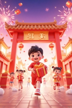 A 3D animation depicting a festive Chinese New Year scene. In the foreground,one children in traditional red clothing,running happily,He was holding a large gifts box in both hands,and behind them is a big red traditional Chinese archway with lanterns and large golden characters for "Fu". In the background,other characters,including adults and children,are dressed in festive costumes and setting off fireworks to celebrate the arrival of the Spring Festival. The sky is lit up by colorful fireworks in pink and purple hues,and the whole scene is filled with a joyful and festive atmosphere,
