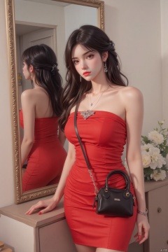 1girl, solo, long hair, breasts, looking at viewer, black hair, dress, bare shoulders, jewelry, earrings, indoors, necklace, bag, bracelet, strapless, red dress, strapless dress, red nails, reflection, mirror, red lips