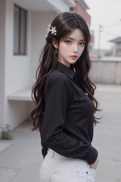 1girl, solo, long hair, breasts, looking at viewer, brown hair, shirt, black hair, hair ornament, long sleeves, brown eyes, jewelry, standing, ass, flower, cowboy shot, earrings, outdoors, looking back, pants, hair flower, from behind, blurry, lips, black shirt, clothing cutout, blurry background, denim, jeans, white pants, red lips