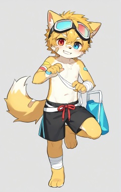 1boy, male focus, furry, furry male, solo, animal ears, goggles, goggles on head, blonde hair, blue eyes, tail, red eyes, smile, heterochromia, bandages, shorts, bandaid on face, standing on one leg, short hair, looking at viewer, bandaid, simple background, grin, leg up, blush, barefoot, male child, standing, grey background