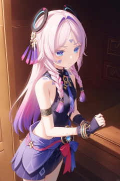 masterpiece,best quality,illustration,dark style,[Artist miwano rag],[Artist toosaka asagi],[Artist wlop],[Artist chen bin], 1girls, solo,loli,loli,loli, (little_girl:1.2),petite:1.1,  long hair, bangs, blue eyes, hair ornament, gloves, holding, bare shoulders, closed mouth,Forehead tattoo, pink hair, purple hair, braid, multicolored hair, black gloves, wooden room,standing,citlali\(genshin impact\),