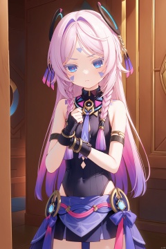 masterpiece,best quality,illustration,dark style,[Artist miwano rag],[Artist toosaka asagi],[Artist wlop],[Artist chen bin], 1girls, solo,loli,loli,loli, (little_girl:1.2),petite:1.1,  long hair, bangs, blue eyes, hair ornament, gloves, holding, bare shoulders, closed mouth,Forehead tattoo, pink hair, purple hair, braid, multicolored hair, black gloves, wooden room,standing,citlali\(genshin impact\),