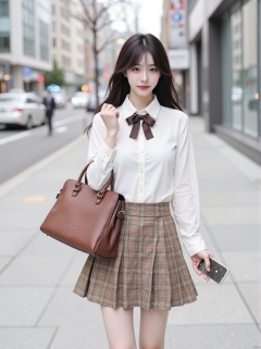 a model of an Asian girl is standing on a sidewalk, holding a cell phone in her right hand. She is dressed in a white button-down shirt, a brown plaid skirt, and a brown bow tie. Her brown purse is draped across her left shoulder, adding a pop of color to her outfit. The background is blurred, suggesting a cityscape.