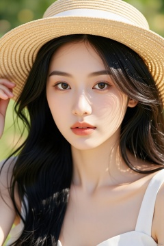 A close-up shot of a young Asian woman with long dark hair and a straw hat on her head. The woman's eyes are blue and her eyebrows are brown. Her eyebrows are light brown and her lips are a darker pink. She is wearing a white dress with a white collar. The background is blurred, but it appears to be a sunny day.