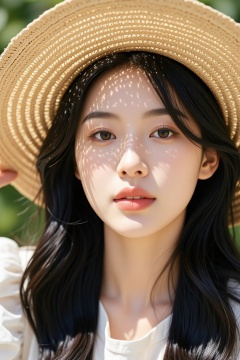 A close-up shot of a young Asian woman with long dark hair and a straw hat on her head. The woman's eyes are blue and her eyebrows are brown. Her eyebrows are light brown and her lips are a darker pink. She is wearing a white dress with a white collar. The background is blurred, but it appears to be a sunny day.