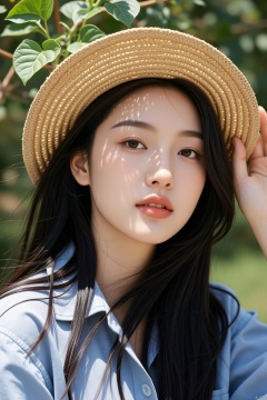 a close-up shot captures a young Asian woman with long dark hair, wearing a straw hat. Her eyes are a piercing blue, and her lips are a lighter shade of pink. Her hair cascades over her shoulders, adding a touch of texture to her face. She is wearing a light blue shirt, while her left hand is resting on her head. The background is blurred, suggesting a natural setting.