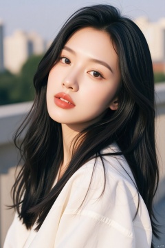 A close-up shot of a woman with long dark brown hair, a white shirt, and a red lipstick. The background is blurred, with buildings in the distance. The woman's eyes are wide open, and her lips are pursed. She has a slight smile on her face.