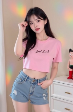 The image shows a young woman standing in a room with a rainbow in the background. She is wearing a pink crop top with the words "Good Luck" written on it and denim shorts. She has long dark hair and is posing with one hand on her hip and the other resting on her thigh. On the right side of the image, there is a small figurine of a cat wearing red rain boots. The figurine appears to be made of plastic and is placed on a white dresser.