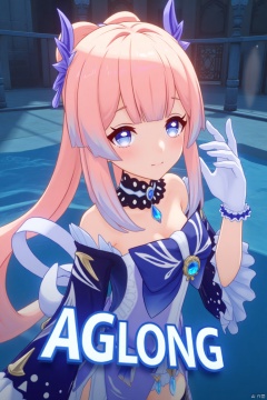 1girl, solo, long multicolored hair with pink and blue tones, looking at viewer with a blush and a closed-mouth smile, bangs framing her face, blue and purple eyes, wearing a hair ornament with a bow-shaped design, thighhighs, white gloves, long frilled sleeves, bare shoulders, detached collar, partially submerged in water, cinematic lighting, dynamic composition, detailed background with a poster theme, high contrast, sharp focus, dramatic atmosphere, three-dimensional text AGlong in the middle below, inspired by Sangonomiya Kokomi from Genshin Impact, blue horns, frills, wide sleeves, half gloves, bow, and a vision, movie poster style.