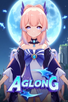 1girl, solo, long multicolored hair with blue, pink, and gradient tones, looking at viewer with a smile, bangs framing her face, blue and purple eyes, wearing a hair ornament with a bow-shaped design, sidelocks, detached sleeves, white gloves, wide sleeves, bare shoulders, bowtie, half gloves, and a vision, inspired by Sangonomiya Kokomi from Genshin Impact, cinematic lighting, dynamic composition, detailed background with a poster theme, high contrast, sharp focus, dramatic atmosphere, three-dimensional text AGlong in the middle below, surrounded by fish and zoom layer effects, movie poster style.