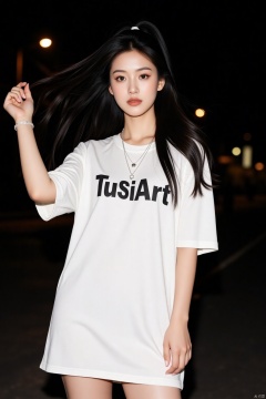 a woman with long dark hair,High ponytail,wearing a white long T-shirt with the words "TuSiArt" in black letters. She is wearing a silver necklace with a heart charm on it,and a bracelet on her left wrist. Her left hand is raised in the air,while her right hand is resting on her hip. The background is dark,with a few lights visible.thighs