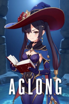 1girl, solo, long black hair with bangs, twintails, medium breasts, small breasts, wearing a witch hat, blue headwear, black gloves, detached sleeves, cape, leotard, bodystocking, thighlet, pantyhose, jewelry, earrings, smiling, looking at viewer, holding a book, standing in water with star symbols, cinematic lighting, dramatic atmosphere, high contrast, sharp focus, detailed background with a poster theme, dynamic composition, three-dimensional text AGlong in the middle below, movie poster style, inspired by Mona from Genshin Impact.