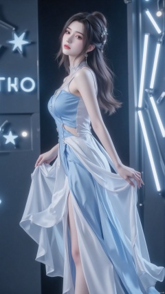 Inside the studio, Asian women elegantly spin in slim fit white and blue dresses, with skirt corners flying. Her gaze is focused on the distance, with spotlights illuminating her delicate makeup and soft hair. A simple geometric background board is arranged around, highlighting the fashionable photo texture.