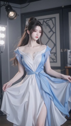 Inside the studio, Asian women elegantly spin in slim fit white and blue dresses, with skirt corners flying. Her gaze is focused on the distance, with spotlights illuminating her delicate makeup and soft hair. A simple geometric background board is arranged around, highlighting the fashionable photo texture.