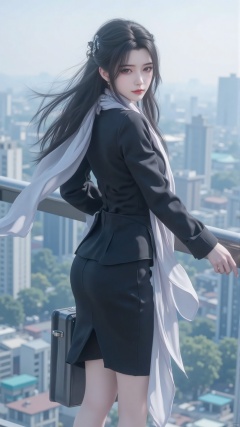 A beautiful woman dressed in a slim fit black suit and skirt, wearing a white silk shirt and a delicate scarf tied around the collar, wearing black high-heeled shoes, and carrying a simple briefcase, is seen on the open-air observation deck of a high-rise building in the city. She turned to the camera, her long black hair swaying gently in the wind, her gaze fixed on the distance, with the bustling city skyline behind her, showcasing the courage and confidence of a professional elite.