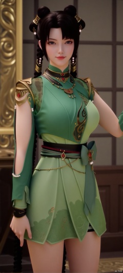 (high definition, Best quality, masterpiece, 4K, exquisite skin), 1girl, solo, green dress, breasts, looking at viewer, room,standing