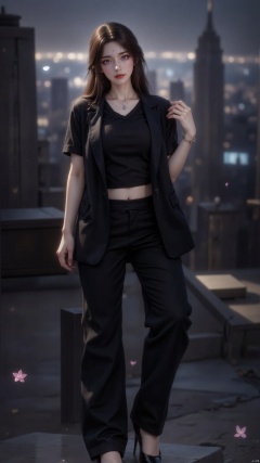yuechan-zichu,a medium-sized woman stands in front of a backdrop of a cityscape. She is dressed in a black t-shirt, a black blazer, and black pants. Her hair is styled in a bob, and her eyes are a piercing blue-green. She has a silver necklace around her neck, adding a touch of contrast to her outfit. Her lips are a deep red, and she has a slight smile on her face. The backdrop is blurred, creating a stark contrast to the woman's outfit.a medium-sized woman stands in front of a backdrop of a cityscape. She is dressed in a black t-shirt, a black blazer, and black pants. Her hair is styled in a bob, and her eyes are a piercing blue-green. She has a silver necklace around her neck, adding a touch of contrast to her outfit. Her lips are a deep red, and she has a slight smile on her face. The backdrop is blurred, creating a stark contrast to the woman's outfit.