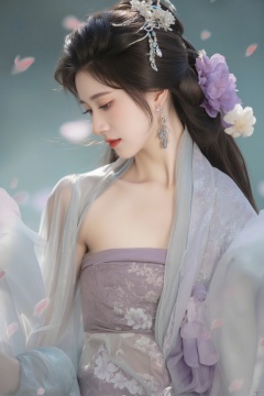 hf-hd,1 girl,earrings,eyelashes,a charming face,glowing lips,clavicle,shoulder exposure,floating petals,dreamy and beautiful,hanfu,medium breasts,cleavge,(upper_body:1.6),(masterpiece, top quality, best quality, official art, beautiful and aesthetic:1.2),