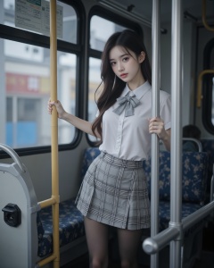 Real photography, super high quality, masterpiece, a girl, wearing a jk uniform, white shirt, light gray checkered pattern bow, light gray checkered skirt, black pantyhose, wearing a delicate watch, standing On a city bus, a hand grasps the handrail, blurred scene inside the city bus, professional composition, real light and shadow<lora:FLUX-极品超模V3:1.2>