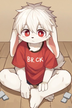 vup_bai,(white hair,red eyes),(floppy ears,lop rabbit ears),red t-shirt,