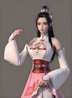 fair_skin,white_skin,Ivory_skin,score_9,<lora:SF_BaiHeiHuai_Pony_Realism-000003:0.7>,hair ornament,dress,black hair,1girl,breasts,large breasts,standing,long sleeves,detached sleeves,facial mark,forehead mark,pink skirt,solo,looking at viewer,simple background,