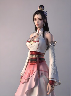 fair_skin,white_skin,Ivory_skin,score_9,<lora:SF_BaiHeiHuai_Pony_Realism-000003:0.7>,hair ornament,dress,black hair,1girl,breasts,large breasts,standing,long sleeves,detached sleeves,facial mark,forehead mark,pink skirt,solo,looking at viewer,simple background,