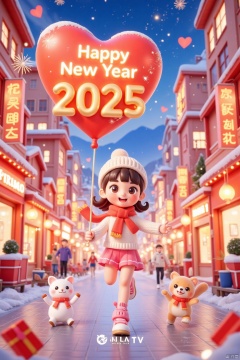 This is a 3D scene New Year poster, a lovely and beautiful girl wearing a white sweater, pink skirt and red scarf running in the street, (holding a huge heart-shaped balloon tied with a thin string, which says "Happy New Year 2025"), at night, the lights are on, and the surrounding buildings and trees are covered with snow. The girl wore a beige hat, with a happy expression on her face, there was a lovely kitten next to the little girl, in the busy night, the city streets with high-rise buildings were full of lanterns, pedestrians came and went, there were snowmen on the ground, the dark blue night sky was dotted with stars, fireworks, Kongming lanterns floating around, the distance is the blurred mountains, brightly lit, A romantic winter and spring snow scene