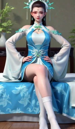 Sitting, crossed legs, whole body, white socks, white silk, one-piece socks, indoors, in the room, on the bed, beside the bed,