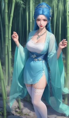 necklace,  white thighhighs, sash,  hand on own chest, nature, forest, bamboo, bamboo forest