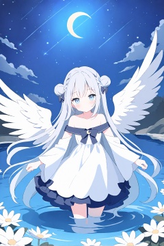 1girl, solo, dress, wings, long hair, sky, feathered wings, wading, white wings, braid, white dress, long sleeves, water, flower, looking at viewer, moon, blush, white hair, hair bun, bare shoulders, cloud, star \(sky\), wide sleeves, outdoors, bow, off-shoulder dress, crescent moon, night, angel wings, white flower, closed mouth, very long hair, night sky, off shoulder, starry sky, hair bow, strapless dress, grey hair, shooting star, detached sleeves