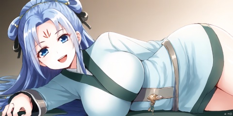 1girl, solo, long hair, breasts, looking at viewer, smile, open mouth, blue eyes, large breasts, hair ornament, long sleeves, ribbon, blue hair, :d, lying, on side, hair rings, forehead mark,