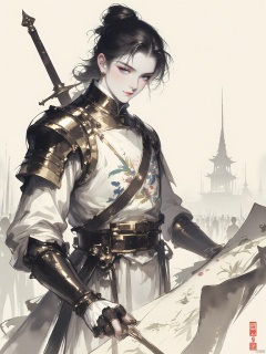 GFSM, A digital rendering of a scholar-general with a strategic mind and a sword at his side. His eyes are sharp and calculating, and his hair is neatly tied back in a bun. He wears a suit of armor adorned with ink-brush paintings of dragons and phoenixes, and his hands rest on a rolled-up military map. The background is a stark, ink-brush landscape of a battlefield, and the overall style is authoritative and strategic, embodying the character's leadership and tactical prowess.