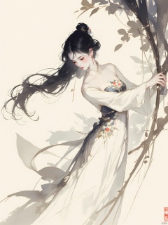 GFSM, A digital ink painting of a dancer with a lithe and flexible body. Her eyes are closed in concentration, and her long hair flows behind her like a black silk ribbon. She wears a traditional Chinese dance costume of flowing sleeves and a tight-fitting bodice, adorned with delicate embroidery. The background is a wash of pale ink, suggesting a moonlit garden, and the overall style is ethereal and graceful, capturing the character's fluid and expressive movement.