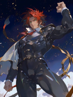GYCH, a powerful, high-angle figure, he sports crimson hair and emerald eyes, clad in a sleek black and silver suit. The figure raises his right arm, fist clenched, against a starry night sky backdrop dotted with golden constellations.