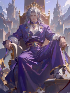 GYCH, a noble, regal figure, with silvery gray hair and deep amethyst eyes, dressed in a royal purple and gold robe adorned with jewels. The figure sits upon a throne, with a backdrop of grand castles and towering mountains.