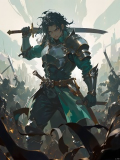 GYCH, a fierce, warrior-like figure, with jet black hair tied back and piercing emerald eyes, clad in armor of polished steel and dark green. The figure stands with sword drawn, facing an army of shadowy foes, with a backdrop of battle-scarred landscapes.