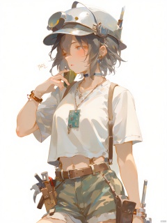 GYCH,The Chinese-style girl wore a pair of ripped camouflage shorts and a simple white T-shirt, with an old circuit board tied to her chest as a pendant. The skin is exposed to sunlight and carries light mechanical oils and dust. Wearing a steel helmet with a few scuffs on his head, a belt on his arm holding various tools