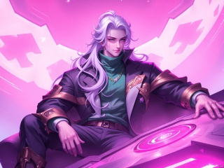 YXMX, a young man with long flowing silver hair and wearing a green and black gold jacket, sits in front of a futuristic control panel. He held the future weapon in one hand, the other hand hanging down. The background features a pink gradient, a large circular installation with abstract luminous shapes,