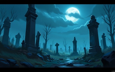 GNSJ, conceptual design, A haunted graveyard with ancient tombstones and eerie whispers. Moonlight casts eerie shadows, and the air is thick with mist. Ghosts and spirits wander the grounds, seeking resolution.