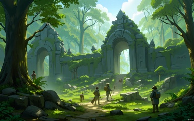 GNSJ, conceptual design, A ancient temple hidden deep within a dense jungle. Overgrown pathways and moss-covered stones. Archaeologists uncover ancient artifacts, revealing the secrets of a lost civilization.